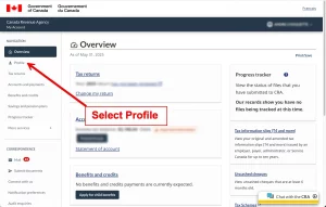- Now that you have logged into your Canada Revenue Account, as shown in Figure T1A.01 above, select the Profile menu option (left side).