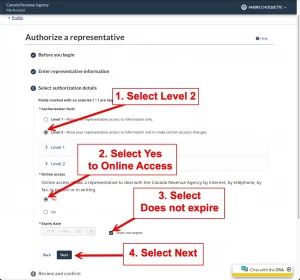 Please then send our office a quick SMS/Text/MMS at 604-813-3539 (Click to SMS/Text/MMS Now) to let us know that you have added our firm as your authorized representative. Our firm will log into the CRA Authorized Representative online portal to confirm access to all of your CRA business accounts (level 2) with no expiry date (required).