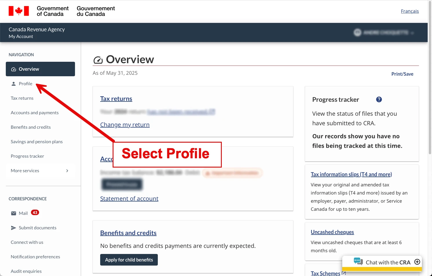 - Now that you have logged into your Canada Revenue Account, as shown in Figure T1A.01 above, select the Profile menu option (left side).